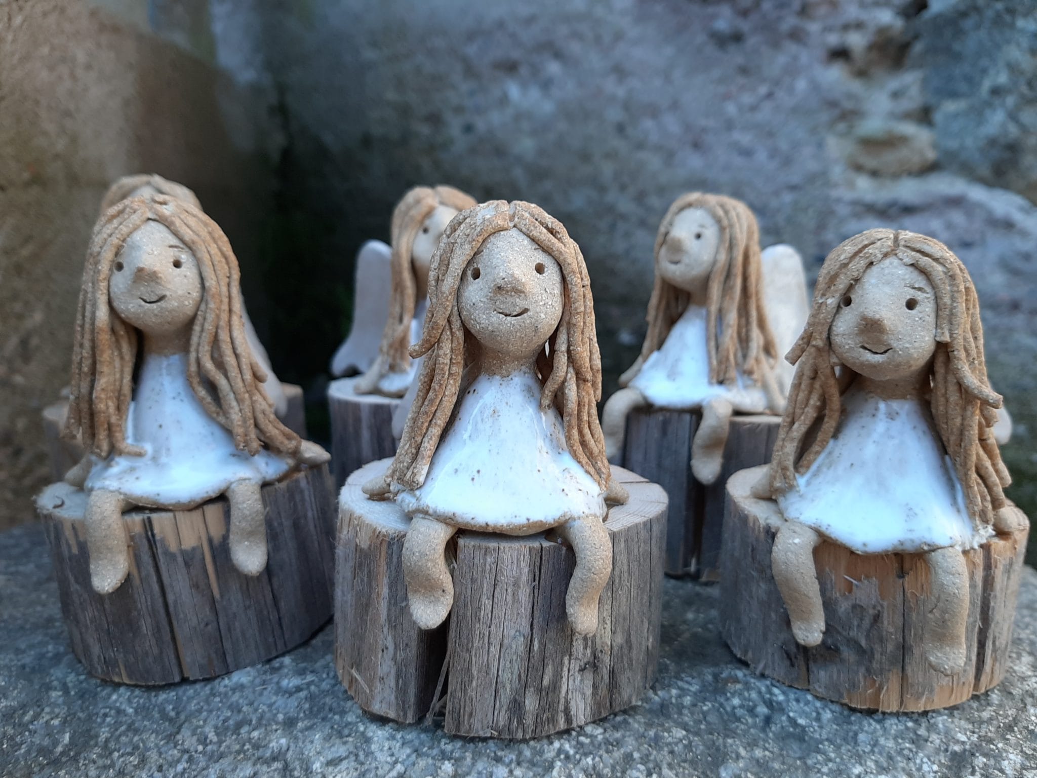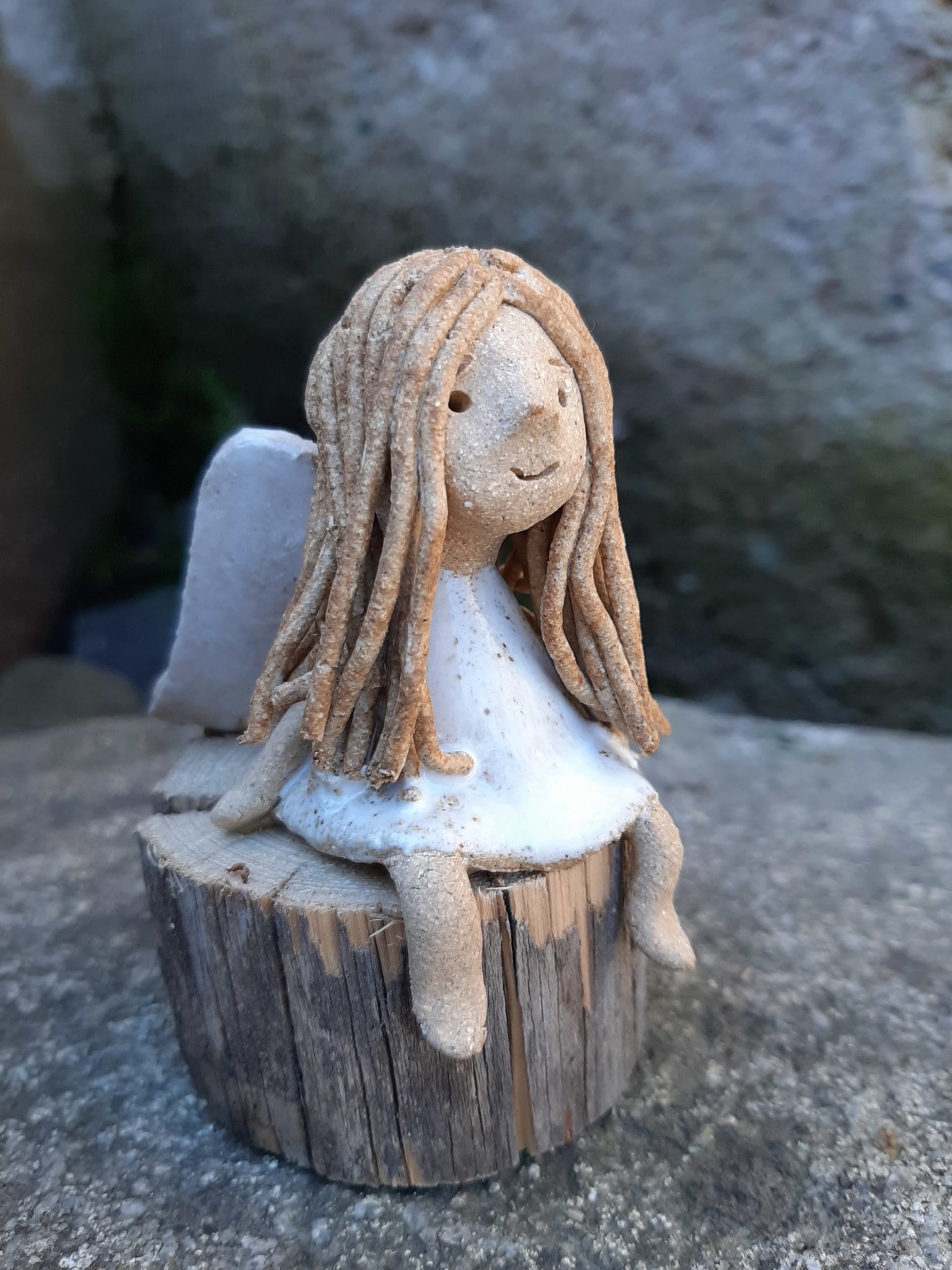 Keraaminen enkeli jolla kiiltävä valkoinen mekko. Istuin vanhaa puuta.