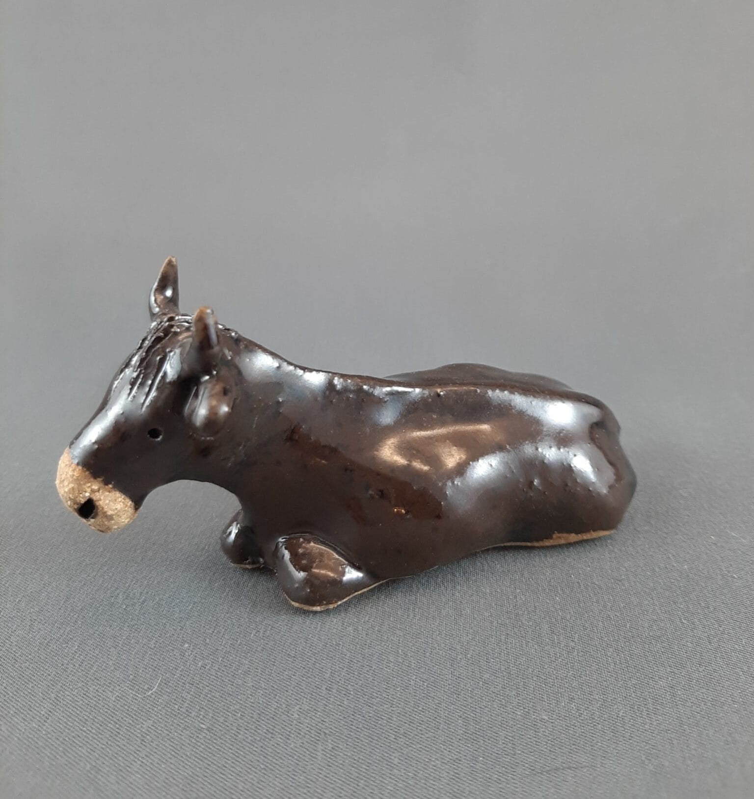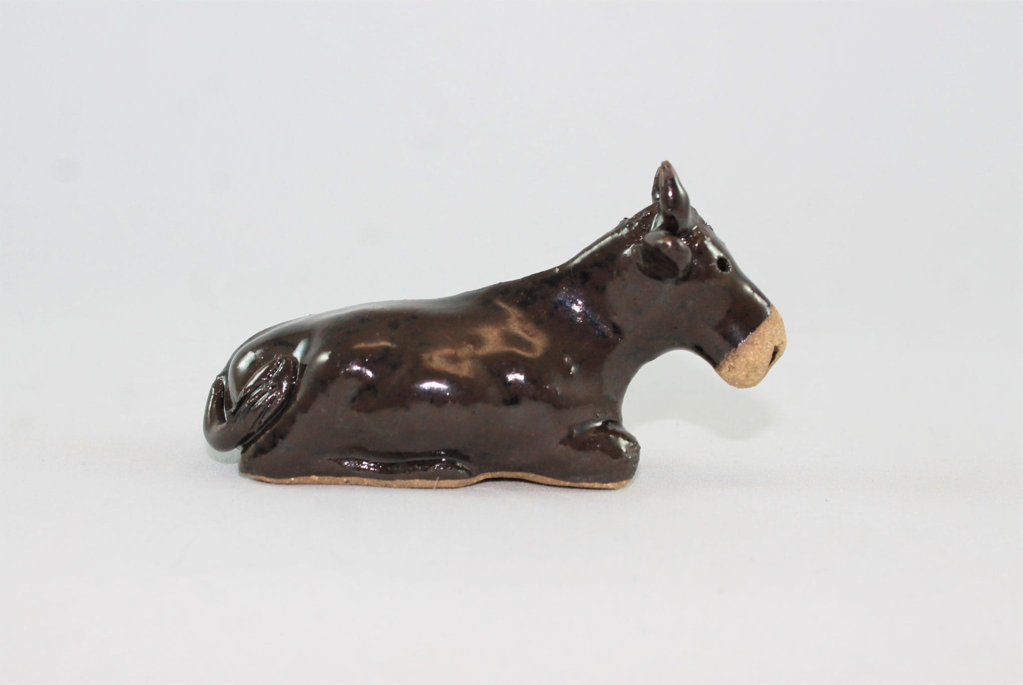 Keraaminen härkä kiiltävällä tummanruskealla miltei mustalla lasitteella.