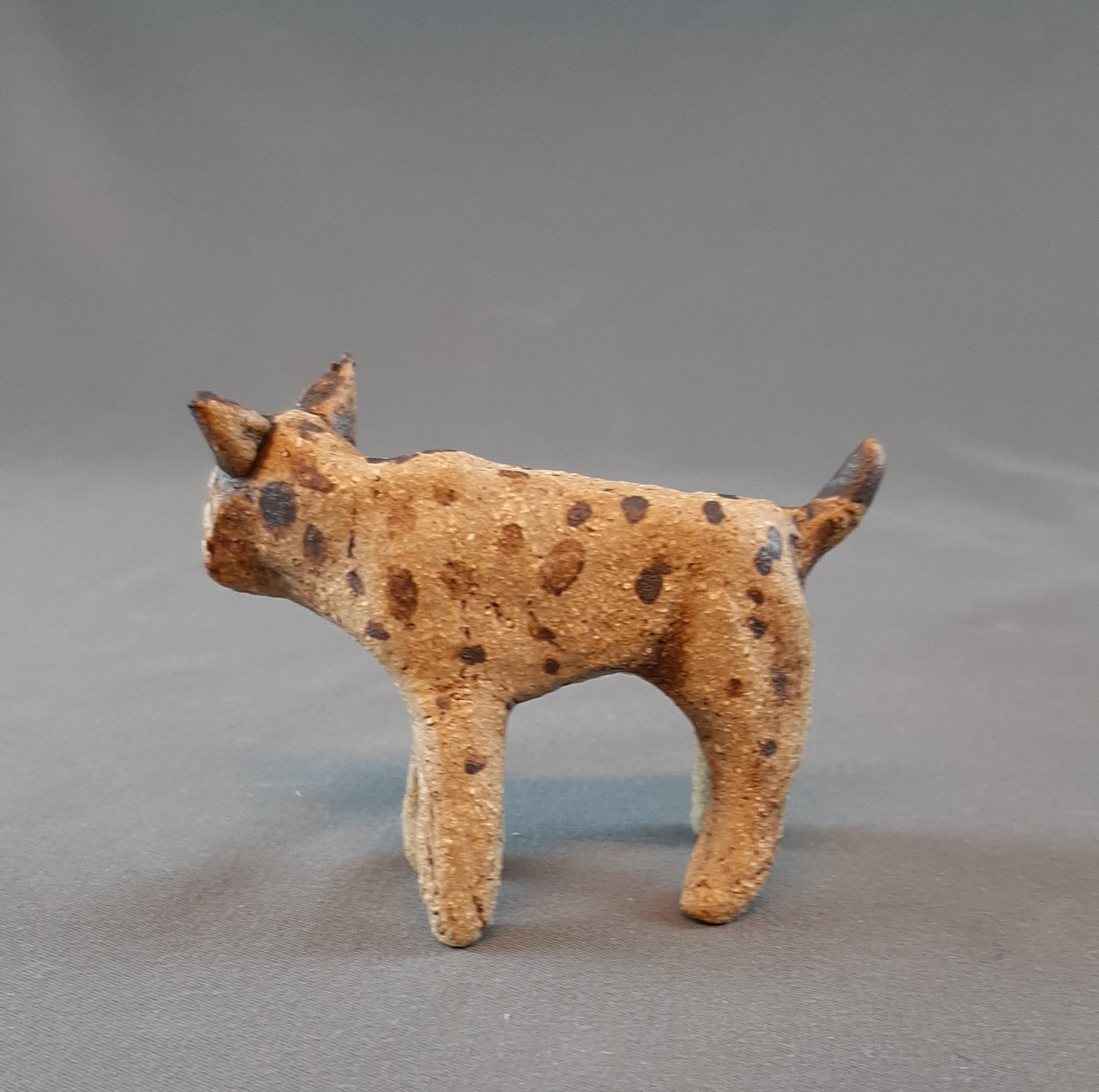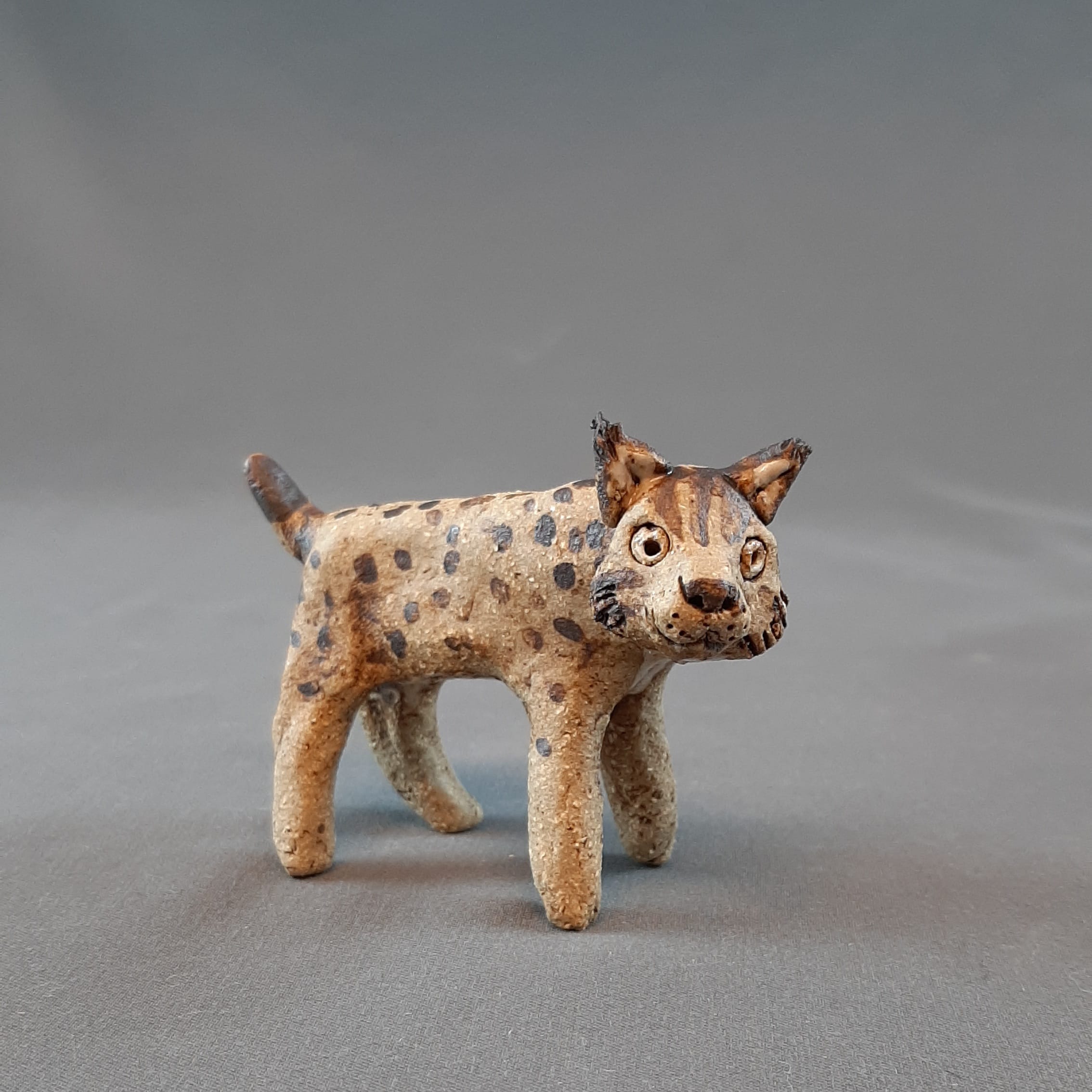 Keraaminen ilves tupsukorvilla ja täplikkäällä turkilla. Korvissa ja vatsan alla valkoista.
