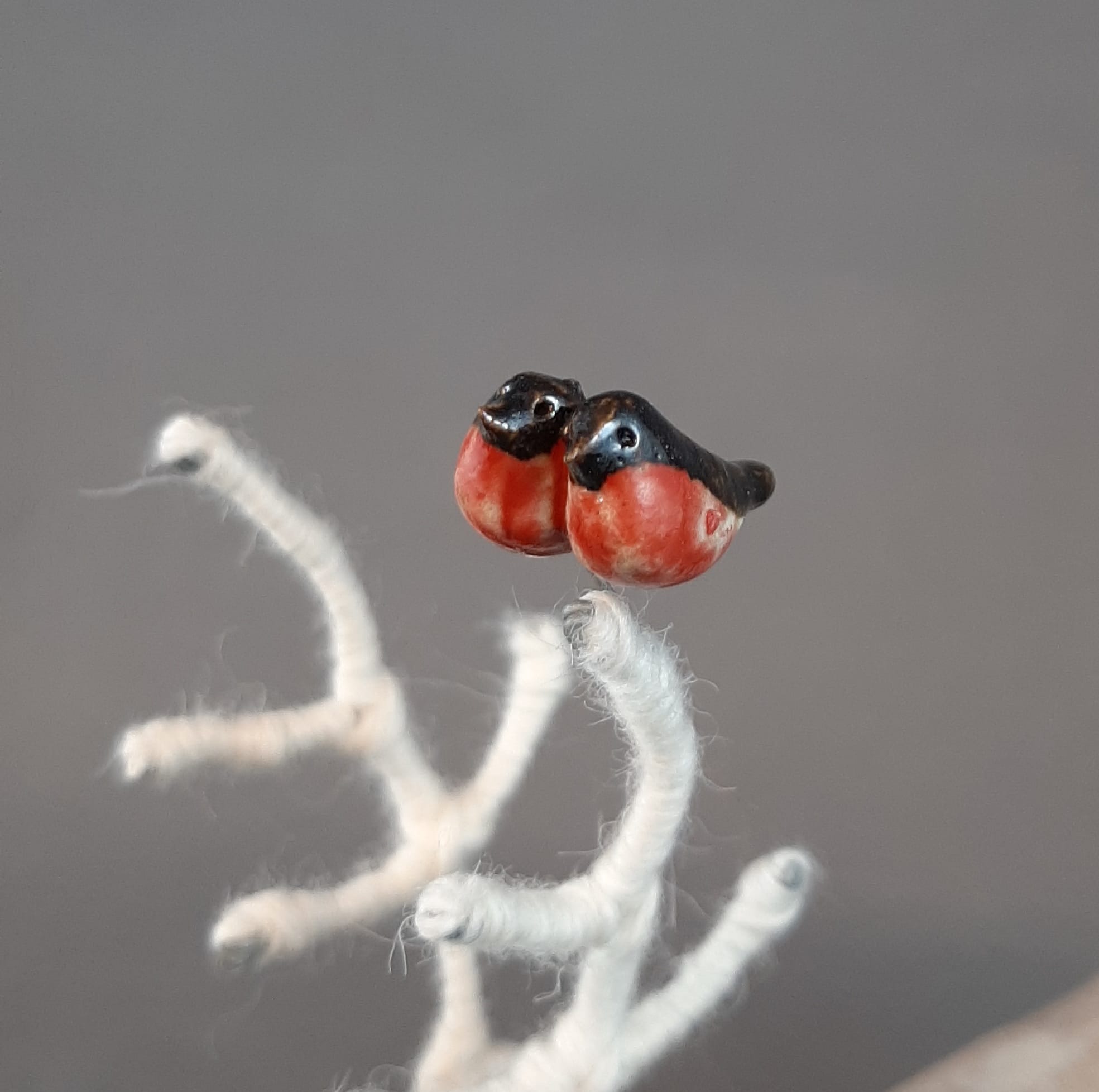 Punatulkkupariskunnan pohjassa pätkä rautalankaa, jonka avulla punatulkut on helpompi ripustaa kuuseen tai poron sarviin.